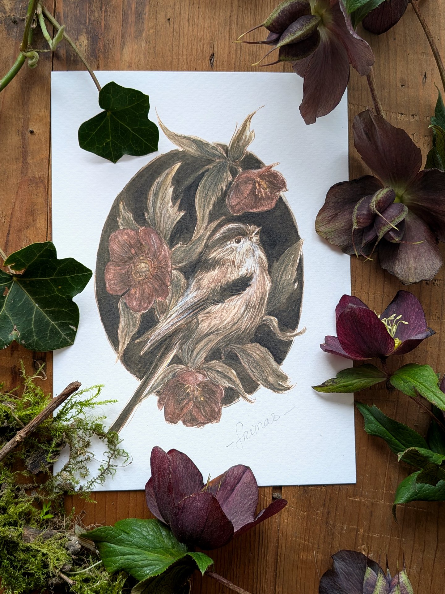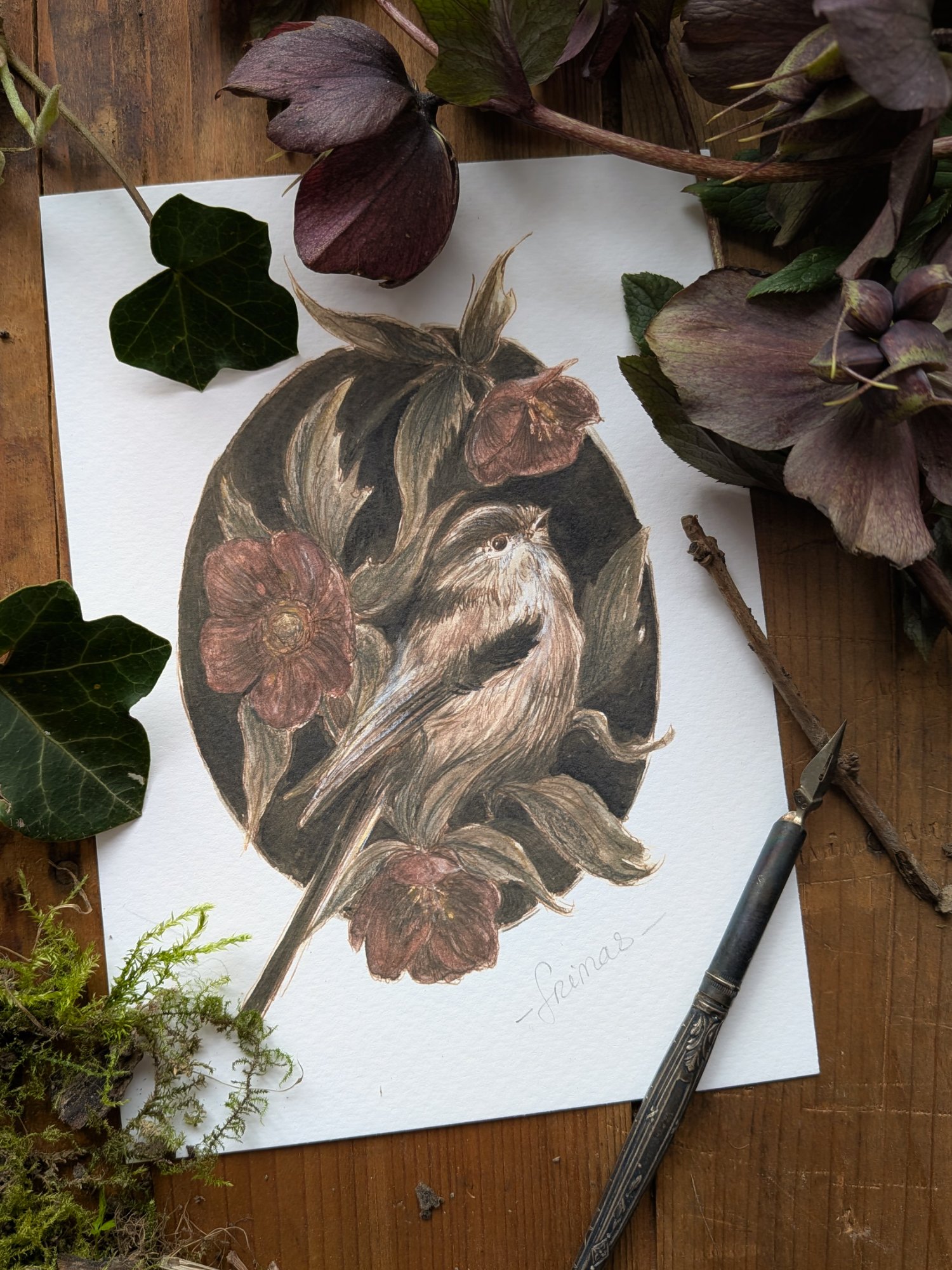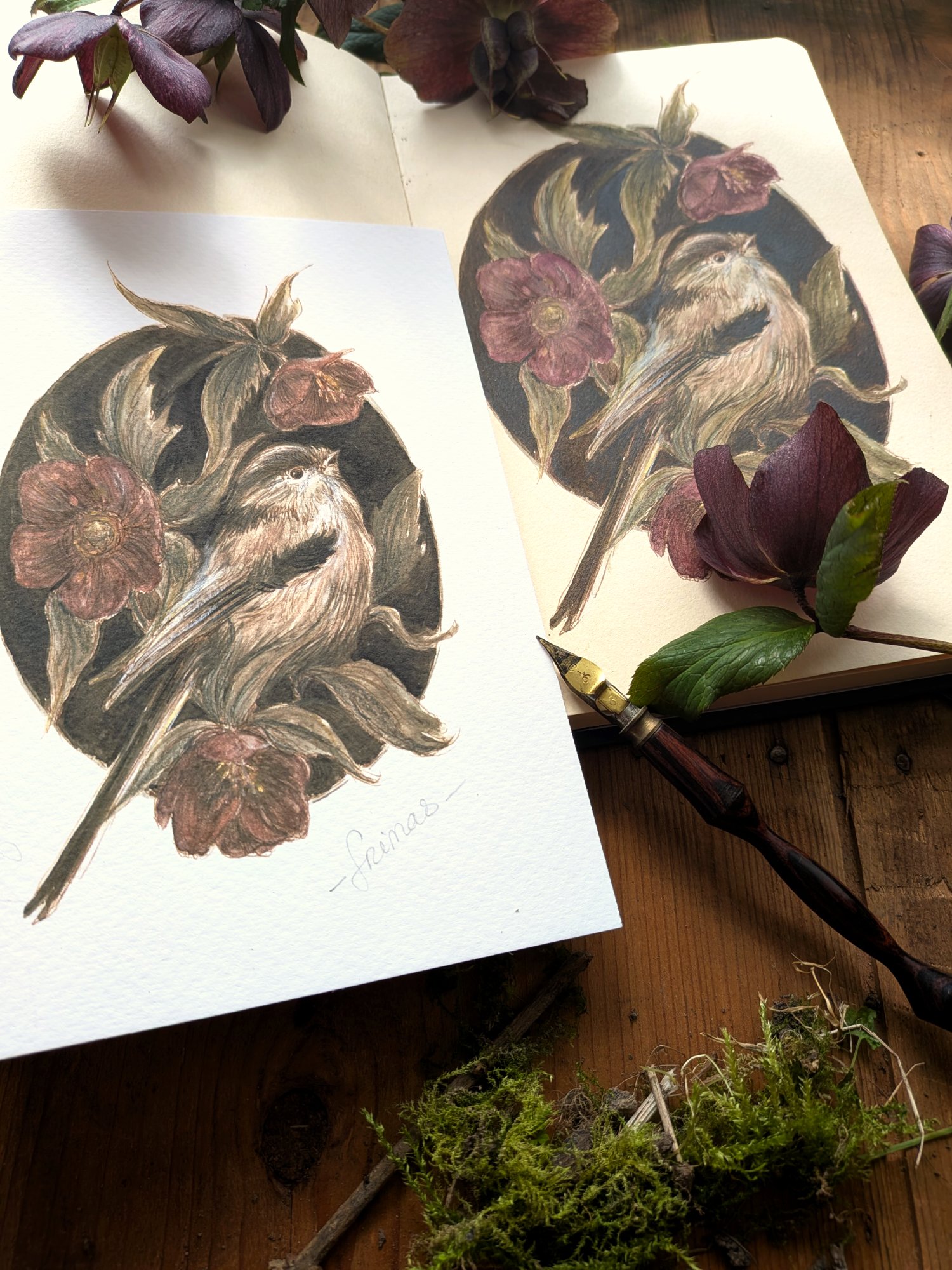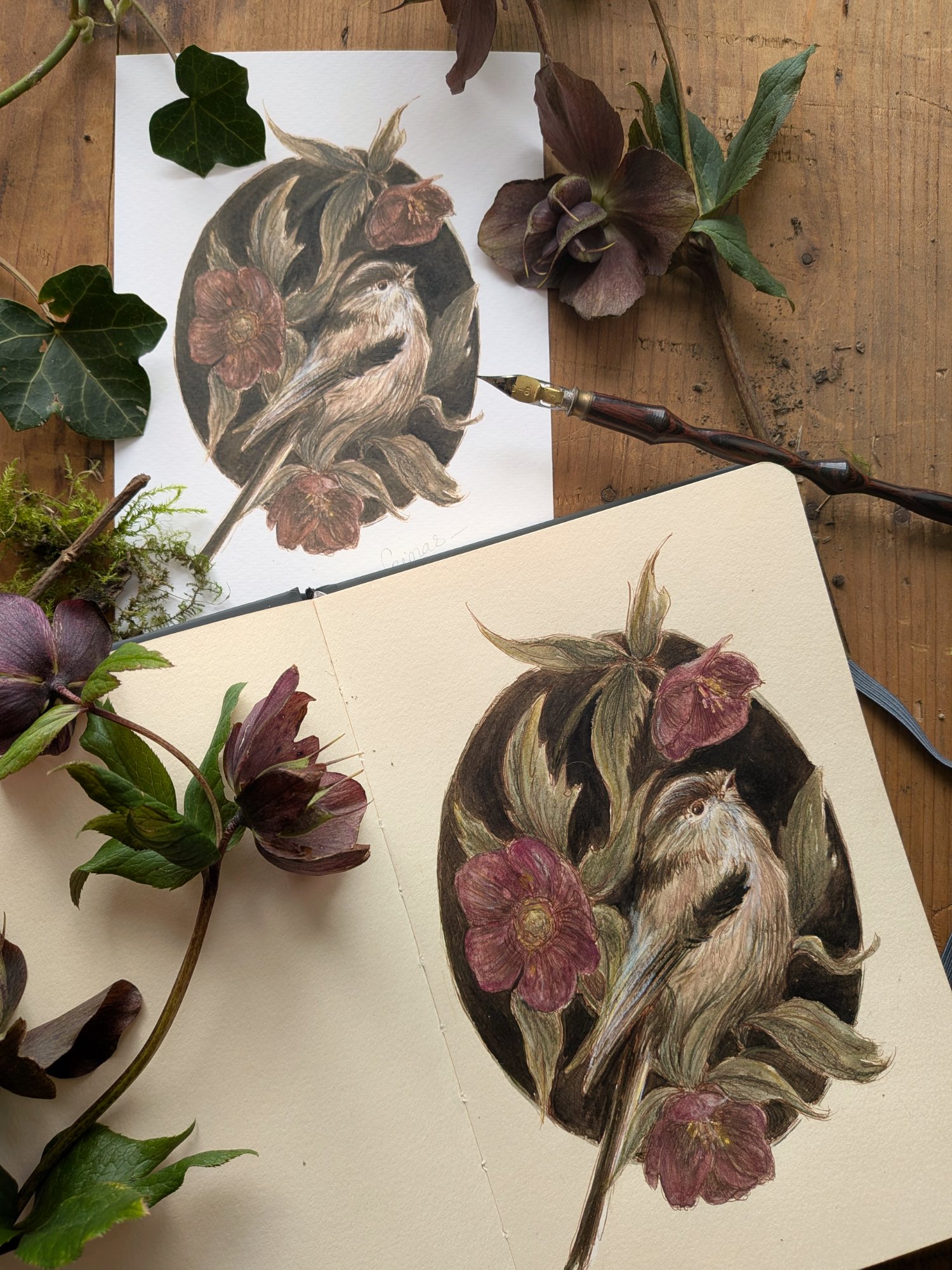 Frimas ou orite aux hellebores – illustration nostalgique à la plume et aquarelle