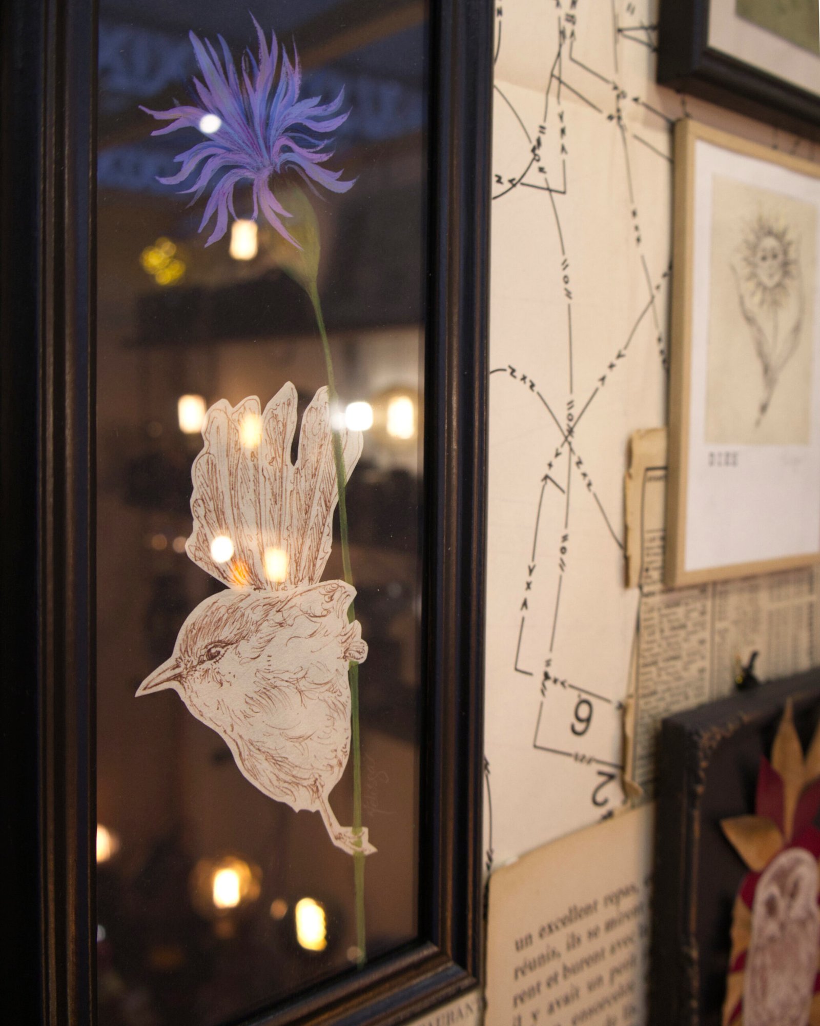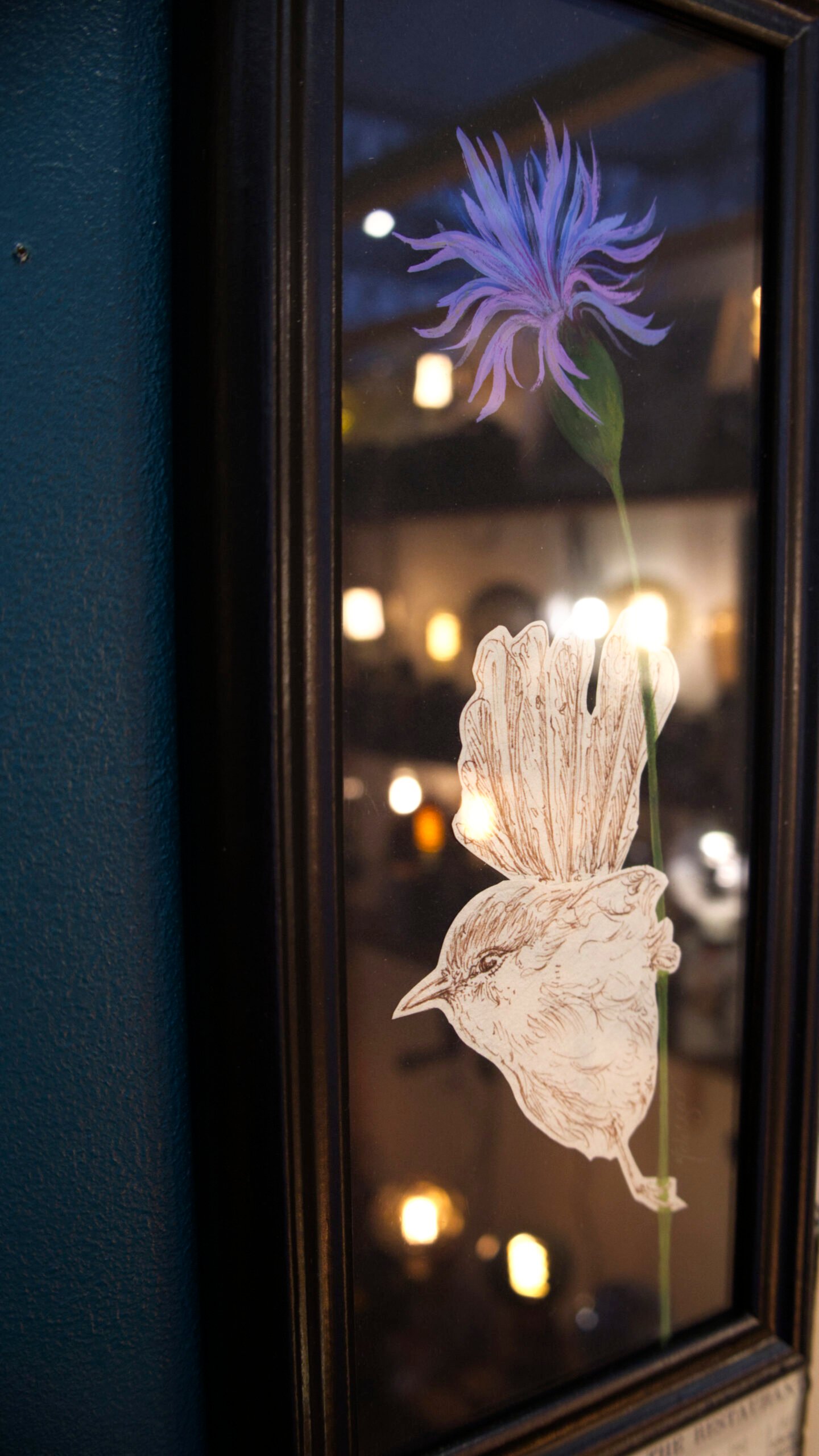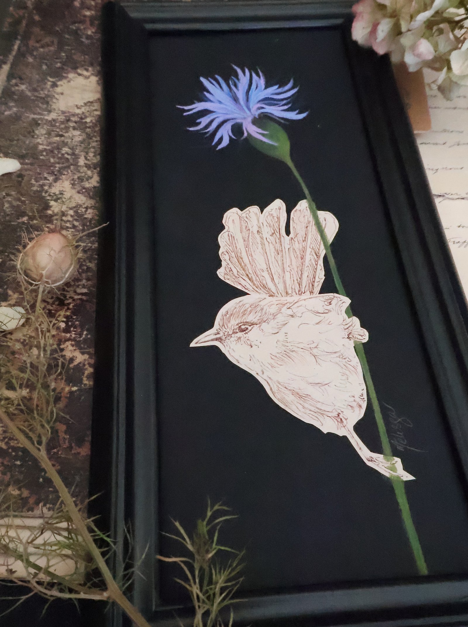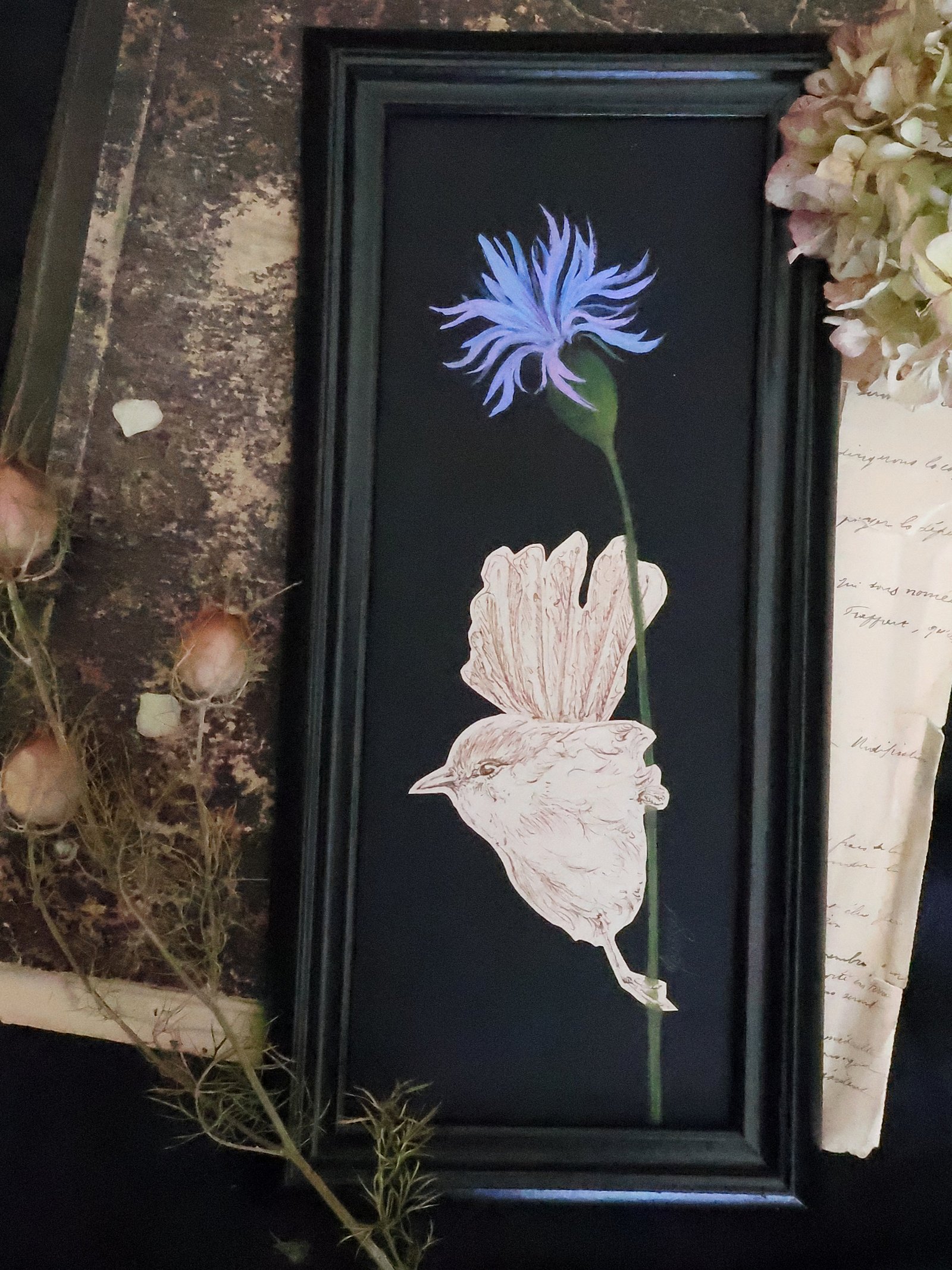 « Guetteur au bleuet » – Oiseau perché dessiné sur fleur à la gouache